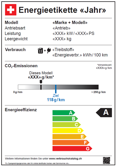 - Sie muss gut sichtbar und lesbar am Personenwagen oder in dessen unmittelbarer Nähe angebracht werden. Sie muss mindestens gleich gut sicht- und lesbar platziert sein wie allfällige Informationen zu Preis und Ausstattung des Personenwagens.